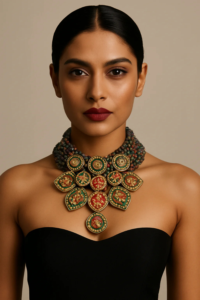 A true celebration of style, this Indo-Western choker is crafted with vibrant multicoloured onyx stones and intricate ethnic tukdis. Designed to sit gracefully close to the neck, it adds a touch of effortless glamour to any outfit. Whether paired with contemporary silhouettes or traditional ensembles, this versatile piece makes a bold yet graceful statement—perfect for festive soirées and elegant evenings alike.