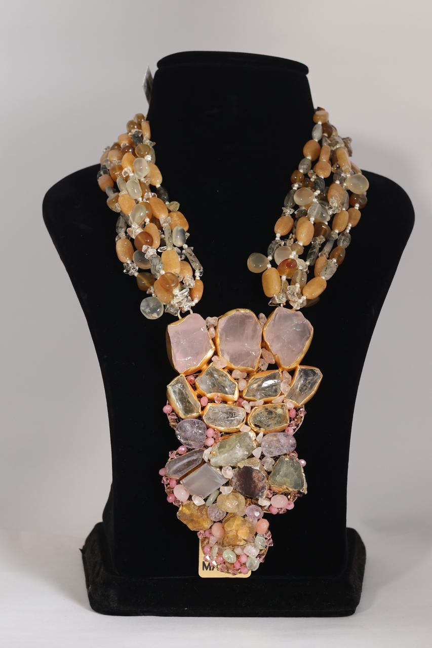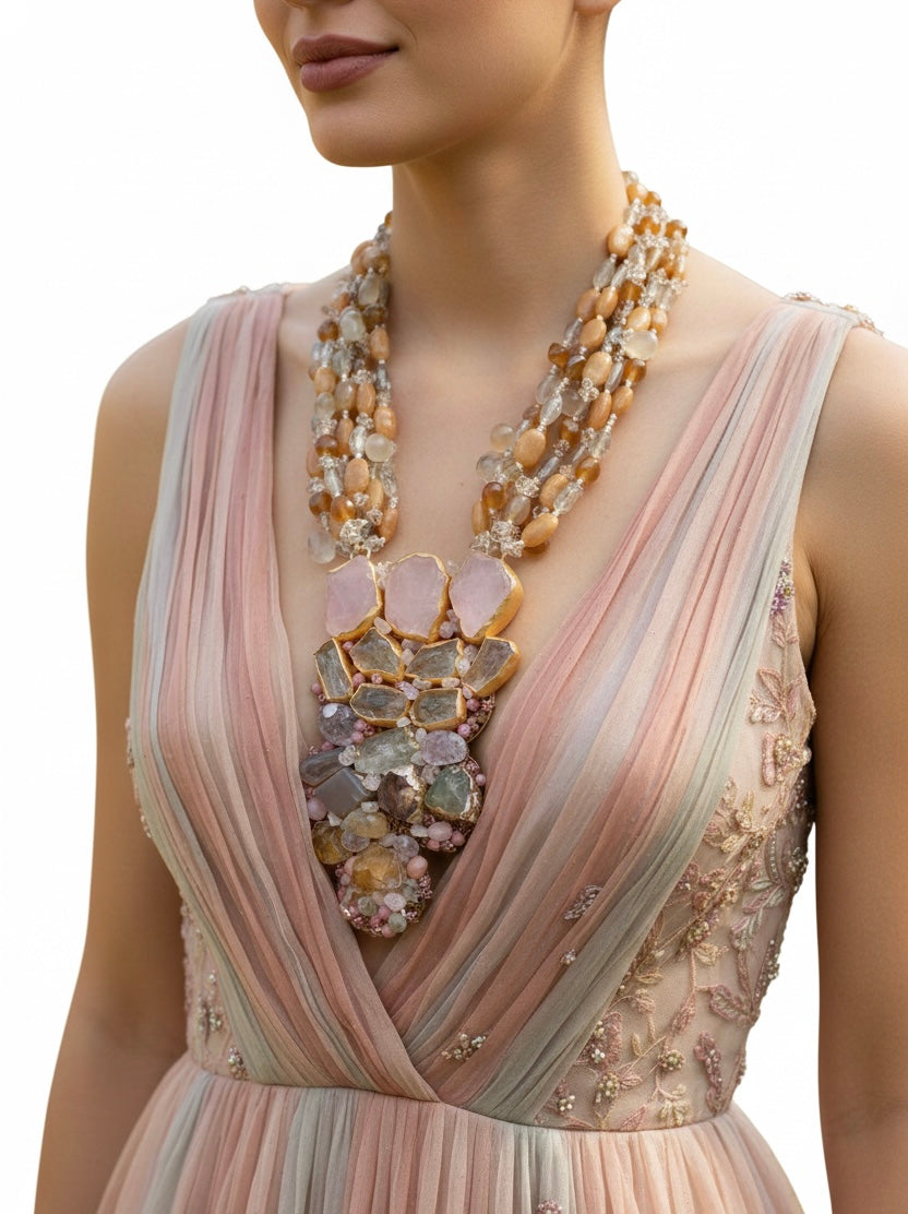 At the heart of this design lies hand-selected, multi-tonal raw gemstones. Featuring the soft blush of Rose Quartz, the clarity of Aquamarine, and hints of Amethyst and Citrine, each stone is individually bezel-set in a rich gold-tone finish to highlight its unique, jagged geometry.The pendant is suspended from a lush, multi-strand collar of polished honey-agate and quartz beads, creating a sophisticated play between smooth textures and raw crystalline edges.