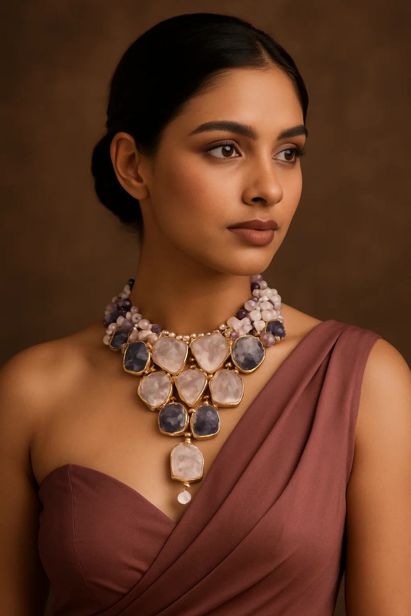 Simply Stylish and Elegant!A gorgeous one-of-a-kind designer piece for fashion lovers! Purely handmade with love by our skilled Indian craftsmen from Jaipur  Handcrafted in high quality brass, Natural Rose Quartz, Labradorite Baroque Pearls and gold plating SIZE:  Weight of the necklace is 165 grams. Drop Length of Necklace: 9 inchesLobster Claw closure. Adjustable. If you are between sizes, we recommend selecting the larger size for a better and more comfortable fit.