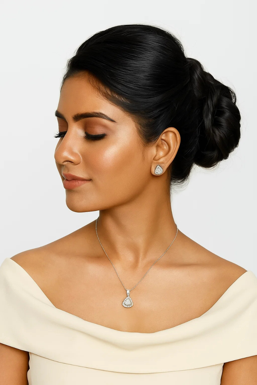 The Eternal Spark Pendant Set features a sleek silver chain with a dazzling solitaire pendant, complemented by matching stud earrings. Its minimal yet radiant design makes it perfect for daily elegance as well as special occasions. A timeless symbol of purity, love, and everlasting beauty.