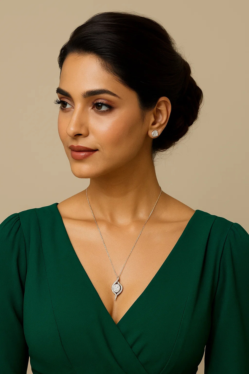 The Leaf Whisper Pendant Set features a delicate silver chain with a graceful leaf-shaped pendant, paired with elegant stud earrings. Its nature-inspired design symbolizes growth, renewal, and timeless elegance. Perfect for those who love minimal beauty with a touch of sophistication.