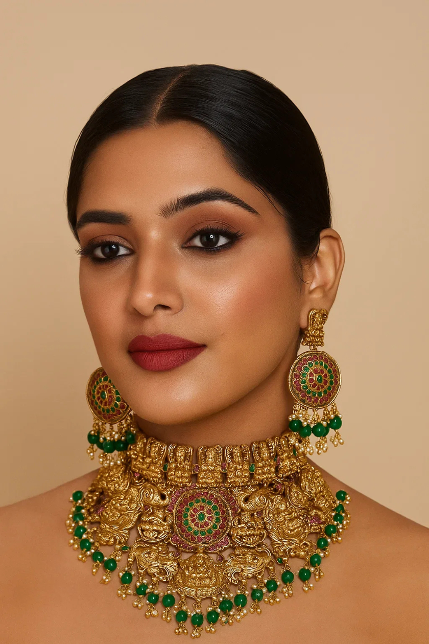 Crafted with temple-inspired motifs and antique gold detailing, The Maharani Temple Set is a celebration of heritage and grandeur. Intricate goddess carvings are paired with a vibrant mandala centerpiece, adorned with multi-hued stones and finished with cascading emerald green and pearl drops.This regal piece, set on a base of high-quality mixed alloys, comes with matching earrings to complete the royal aesthetic. A bold statement for traditional affairs, this choker sits close to the neck and adds divine drama to your bridal or festive look.Elevate your occasion with a piece that channels strength, femininity, and timeless Indian artistry.