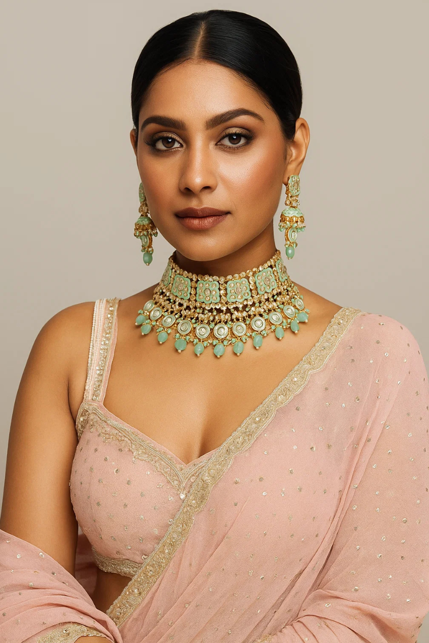 The Meher Choker Set radiates grace with its intricate detailing and soothing aqua-green accents. Paired with matching earrings, it reflects harmony between tradition and modern elegance. A perfect choice for festive occasions, weddings, or royal soirées, it embodies charm, richness, and timeless beauty.