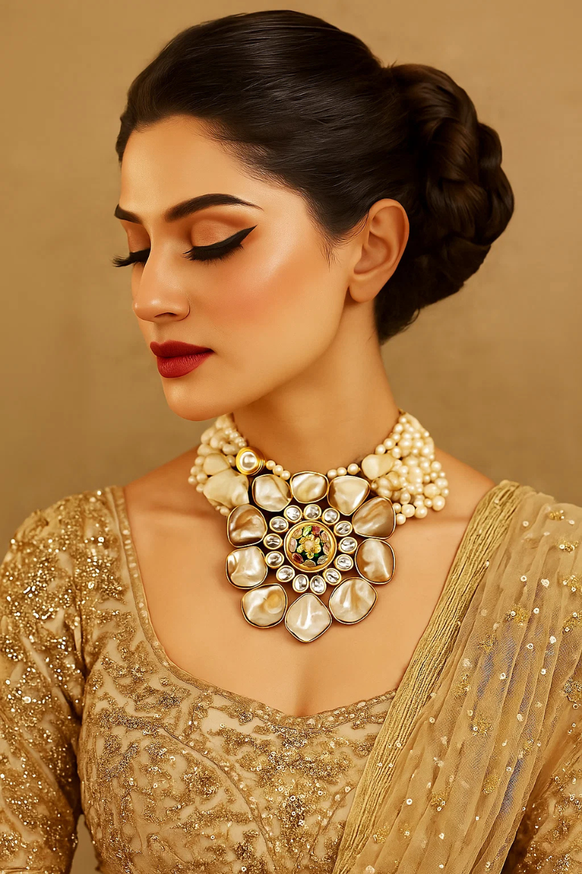 The Pushp Haar Choker blooms with elegance, featuring a floral-inspired centerpiece crafted from radiant pearls and kundan work. Its bold yet graceful design symbolizes prosperity, purity, and timeless tradition. Perfect for weddings and grand occasions, this masterpiece celebrates the artistry of heritage jewelry.