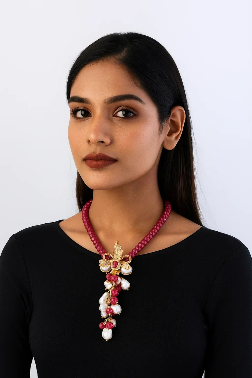 A poetic blend of elegance and grace, The Scarlet Bloom Necklace is crafted with deep wine-toned onyx beads strung delicately around the neck. At its heart lies a striking floral motif adorned with lustrous baroque pearls, ruby-red beads, and hints of gold-toned detailing—creating a cascading effect that feels effortlessly dramatic. This Indo-Western piece is lightweight and thoughtfully designed on a base of mixed alloys, making it the perfect companion for cocktail evenings, festive celebrations, or even statement workwear. It’s bold, feminine, and uniquely Marjani.